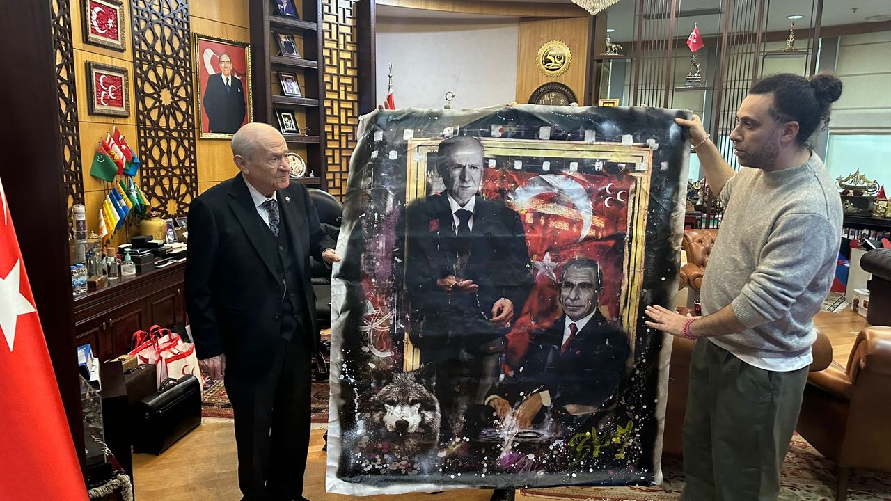 Rssam Ersan Kay, MHP Genel Başkanı Devlet Bahçeli'yi parti genel merkezinde ziyaret etti. Özellikle futbol dünyasının ünlü isimlerini sprey boya ile resmeden Kay, Bahçeli için hazırladığı tabloları hediye etti. Bahçeli, biri hilal formu içinde hazırlanan, 17 Türk devletinin bayrakları da bulunan tablo ile MHP'nin Kurucu Genel Başkanı Alparslan Türkeş ile kendi resmi bulunan poster tabloyu inceledi. Ziyaret, hatıra fotoğrafı çekimiyle sona erdi.
