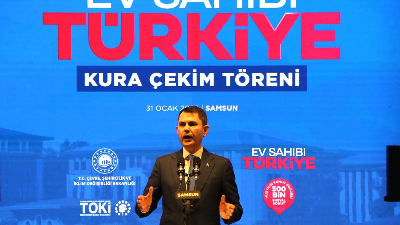 Çevre, Şehircilik ve İklim Değişikliği Bakanı Murat Kurum, Samsun'da ‘Ev Sahibi Türkiye’ kura çekim törenine katıldı. Samsun’da 6 bin 397 konutun kura çekimi Ömer Halisdemir Çok Amaçlı Salon’da yapıldı. Kura çekimine, Samsun Valisi Orhan Tavlı, AK Parti Samsun milletvekilleri Mehmet Muş, Çiğdem Karaaslan, Yusuf Ziya Yılmaz, Orhan Kırcalı, Erhan Aksu, Toplu Konut İdaresi (TOKİ) Başkanı Mustafa Levent Sungur, Samsun Büyükşehir Belediye Başkanı Halit Doğan, ilçe belediye başkanları, kaymakamlar, sivil toplum kuruluşu temsilcileri, protokol üyeleri ve vatandaşlar katıldı.