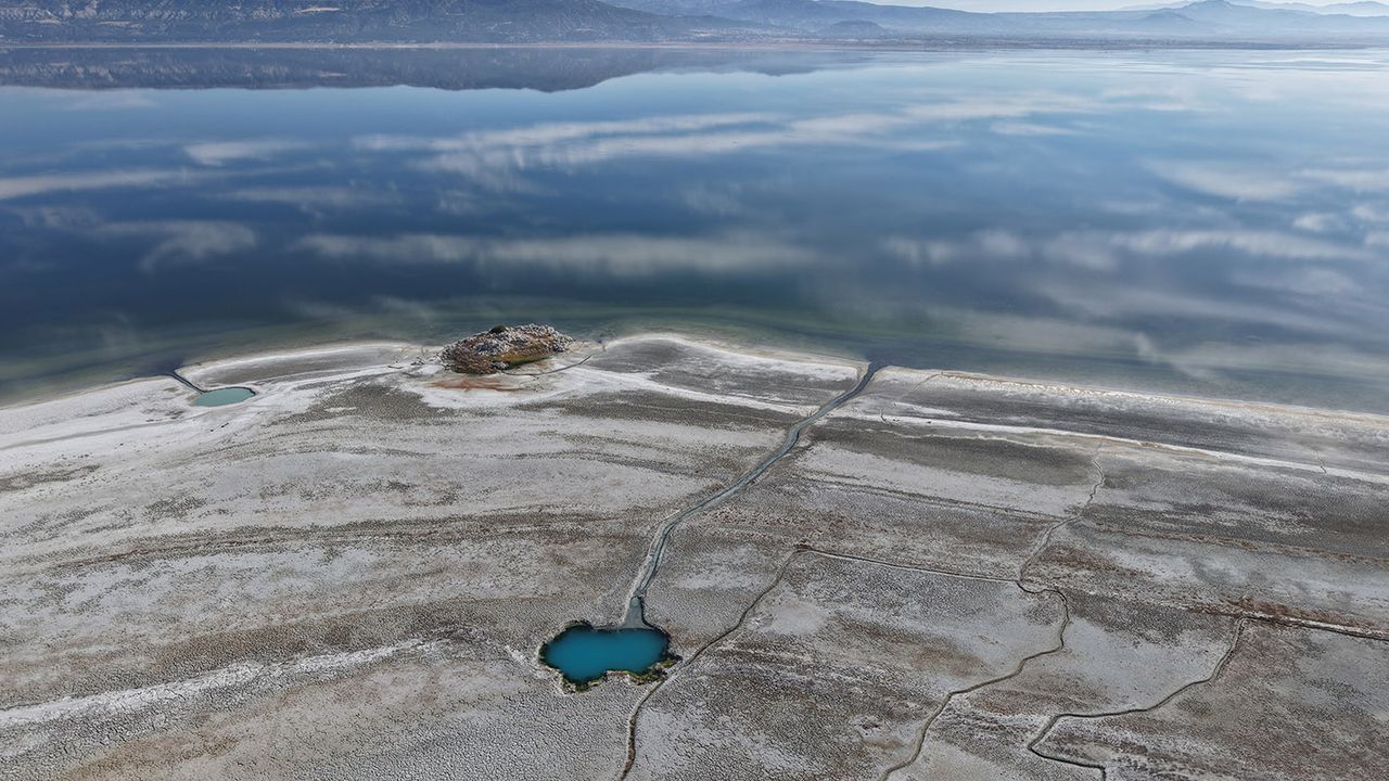 Türkiye'nin en önemli doğal göllerinden Burdur Gölü'ndeki kuraklık son yıllarda hızlandı. Gölün sığ olan doğu tarafında görülen su çekilmeleri, son yıllarda kuzeyinde de ciddi ölçüde arttı. Ayrıca gölün derin kısımları olan batı ve güneyinde de su çekilmelerinin izleri giderek büyüyor. Gölün özellikle kuzey bölgelerinde su çekilmiş alanlardan geriye kalan ve 'Burdur Gölü'nün gözyaşları' olarak nitelendirilen küçük su öbekleri ile 10 yıl önce etrafı suyla kaplıyken çekilen sularla karada kalan küçük adacık, DHA ekibi tarafından görüntülendi.