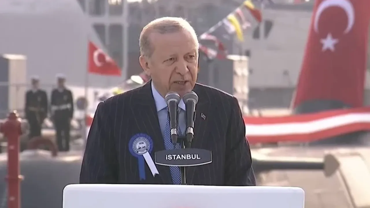 Cumhurbaşkanı Recep Tayyip Erdoğan, İstanbul Tersanesi Komutanlığı'nda “Deniz Platformlarının Hizmete Giriş, Bayrak Çekme ve İlk Sac Kesim Töreni”nde konuşuyor.