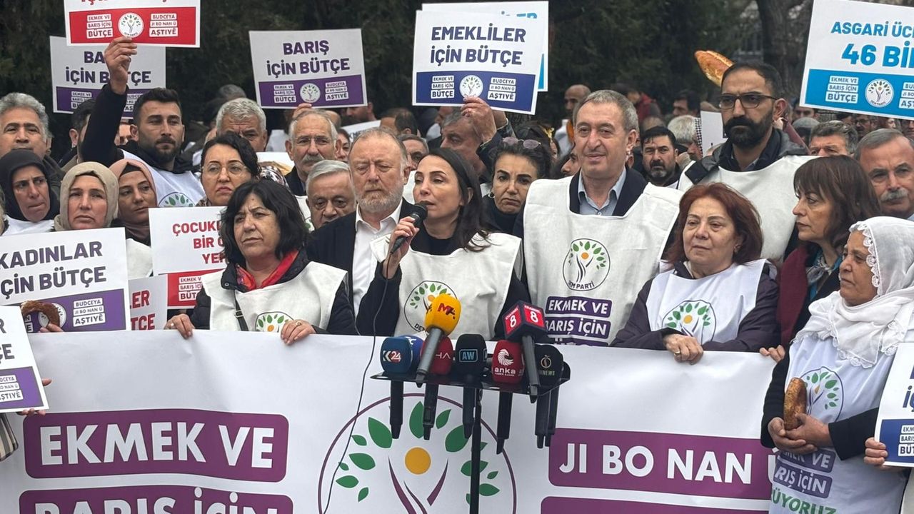 DEM Parti Eş Genel Başkanları Tülay Hatimoğulları ve Tuncer Bakırhan ile partililer, Çankaya ilçesindeki Cemal Süreya Parkı'nda bir araya gelerek, Meclis'e yürüdü. Grup, ellerinde 'Ekmek ve barış için bütçe' yazılı pankart taşıdı. TBMM Dikmen Kapısı'nda grup adına açıklamada bulunan Hatimoğulları, "Bugün Türkiye, hem genel anlamda enflasyon hem de gıda enflasyonunda dünyada ilk 5 içerisinde yer alıyor. Bu; daha çok işsizlik, yoksulluk, hayat pahalılığı, emeklinin geçinememesi, barınamamak, faturaları ödeyememek demektir. 2026 yılı bütçesindeki en temel kaynak ne biliyor musunuz? Yurttaşın sırtına yüklenmiş olan ağır vergilerdir. Bugün sermayeden vergi almayan ve sermayeyi koruyan iktidar anlayışı, bütün vergi yükünü esnafın, işçinin, çiftçinin sırtına yüklemiştir. Bunu kabul etmek mümkün değildir. Bizler, 'Ekmek ve barış için bütçe' demeye devam edeceğiz. Bugün bizler, 'Barış için bütçe' derken, savaşa, özel harp yöntemine, güvenlikçi politikaları ayrılan bütçenin son bulmasını istiyoruz. Yüzyıllık bir mesele olan ve son 50 yılı savaş ve çatışmalarla geçen Kürt sorununun; 'Barışçıl ve demokratik çözülmesi' demek, 'Silaha ve savaşa bütçeden pay ayrılmaması' demektir. Ancak ne yazık ki 2026 yılı bütçesinde; bizler 1 yılı aşkındır barış ve demokratik toplum sürecinden bahsederken mevcut iktidar silaha yani bu anlamdaki bütün kalemlere ciddi anlamda pay ayırmış, hatta geçen yıllara göre daha fazla bütçe vermiştir. Bunu kabul etmek mümkün değildir. Biz buradan bir kere daha haykırıyoruz; 'Savaşa değil halka, emekçiye bütçe' diyoruz" ifadelerini kullandı.