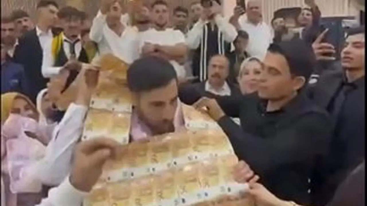 Kızıltepe ilçesinde hafta sonu yapılan aşiret düğününe Avrupa’dan gelen Nehir Vinç, damat olan kardeşi Halil İbrahim ile geline, valizle getirdiği 50 avro ve 200 Türk lirası banknotlarıyla yaptırdığı yeleği giydirdi. Vinç, çifte ayrıca 100 dolarla hazırlanan taçları taktı. Ağabeyinin takılarının çifti şaşırttığı görülen düğüne katılan davetliler ise ağabeyi uzun süre alkışladı. Gelin ve damadın üzeri banknotlarla kaplanırken, o anlar ise çevredekilerin cep telefonuyla görüntülendi.