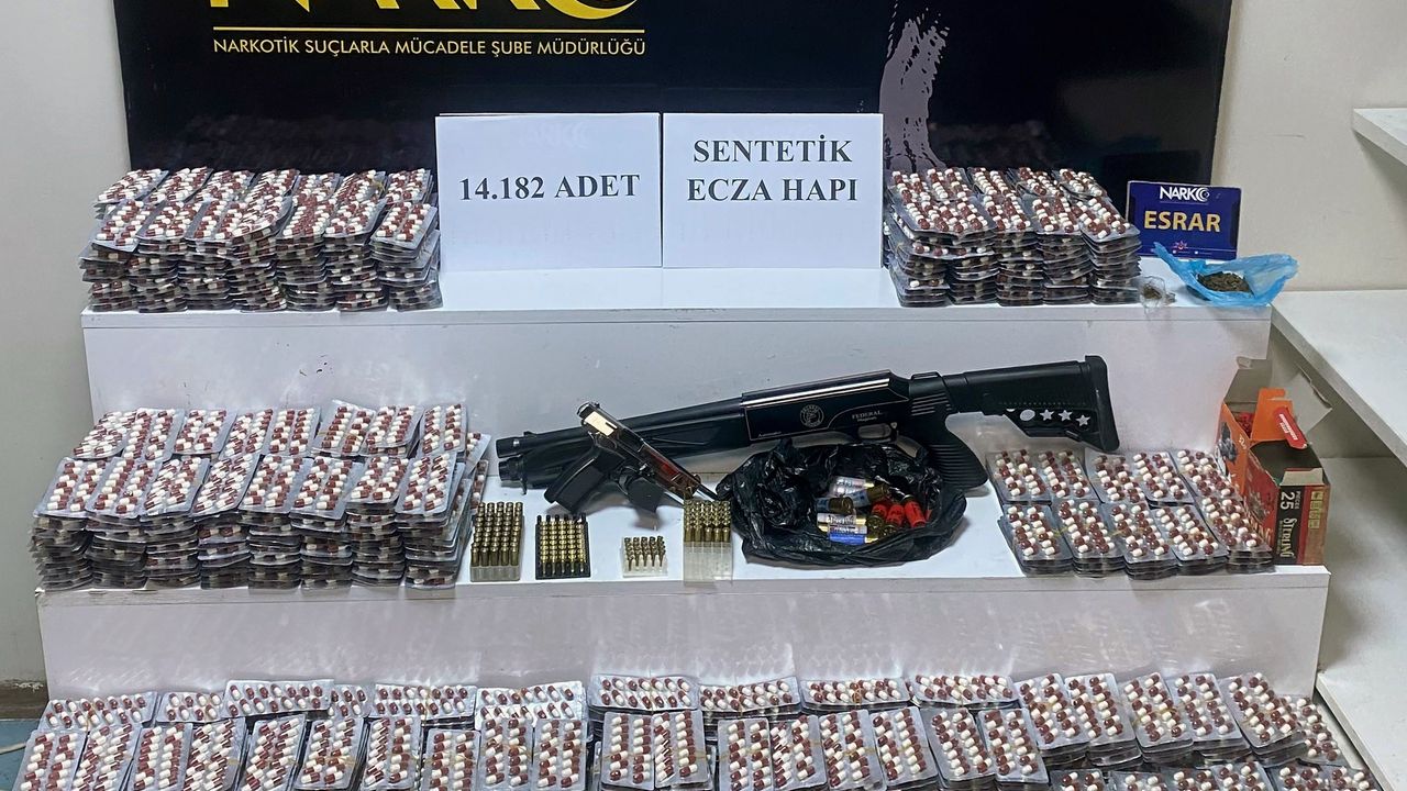 İl Emniyet Müdürlüğü Narkotik Suçlarla Mücadele Şubesi ekipleri, 'torbacı' olarak bilinen uyuşturucu satıcılarına yönelik yaptığı çalışmada B.Ö.'nün kimliğini tespit etti. Ekipler, şüphelinin Yüreğir ilçesi Selahattin Eyyubi Mahallesi'ndeki iş yeri ile Sarıçam ilçesi Buruk Mahallesi'ndeki evine eş zamanlı baskın yaptı. Adreslerde yapılan aramalarda; reçeteye tabi 14 bin 182 uyuşturucu hap, 10 gram esrar ile ruhsatsız tabanca, ruhsatsız av tüfeği ve çok sayıda mermi ele geçirdi. Gözaltına alınan B.Ö., emniyetteki sorgusunda, "Uyuşturucu satışı yapmıyorum. Evde bulunanları kullanmak için satın aldım" dedi. İşlemlerinin ardından adliyeye sevk edilen B.Ö., çıkarıldığı mahkemede tutuklandı.