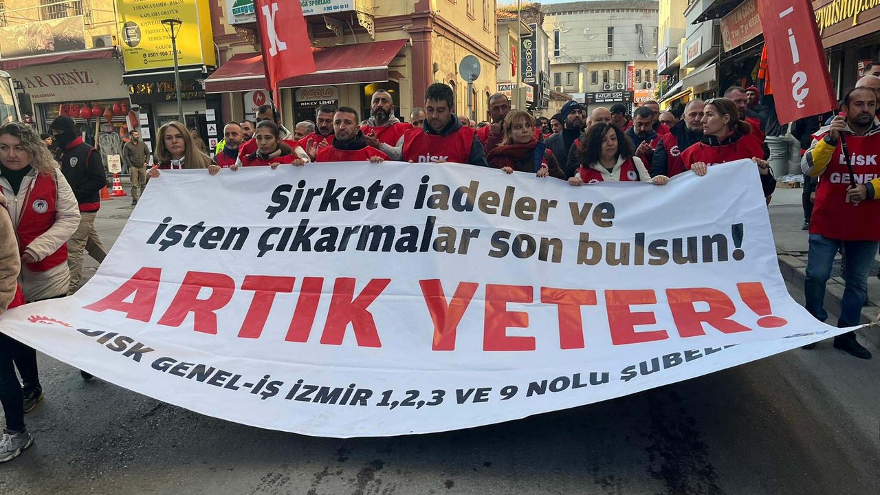 İzmir Büyükşehir Belediyesi iştirakleri İZENERJİ, İZELMAN, İZFAŞ bünyesindeki işten çıkarılan ve iade edilmelerine rağmen işe başlatılmayan 358 işçi 3'üncü gününde eylemlerine devam etti. Konak Pier'de bir araya gelen işçiler Kültürpark 9 Eylül kapısında kadar sloganlar eşliğinde yürüdü. DİSK/Genel-İş İzmir 2 No'lu Şube Başkanı Ercan Gül, "Mücadelemizin üçüncü günündeyiz. Almış olduğumuz karar doğrultusunda Konak Pier'den Basmane Fuar Kapısı'na yürüyüşümüzü gerçekleştirdik. Günlerdir, aylardır bu kapıda talebimizi dile getiriyoruz. Bugün üçüncü günümüz ancak hala bir iletişim yok, hala masa kurulmuyor. Biz buna istinaden dün itibariyle kurumları gezerek destek olunmasını talep ettik. Hangi kurum ve kuruluş varsa, bize destek olacak her kapıyı çalmaktan çekinmeyeceğiz" dedi.