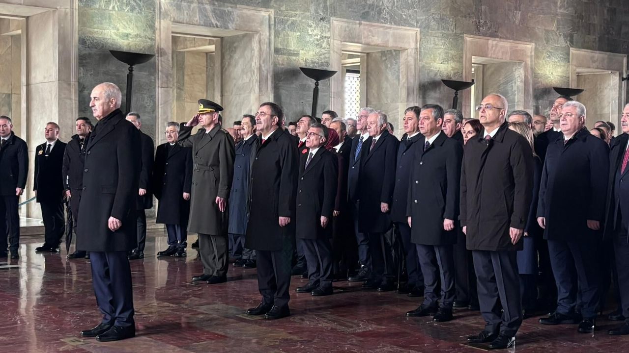 TBMM Başkanı Numan Kurtulmuş ve beraberindeki heyet, Aslanlı Yol'dan yürüyerek, Atatürk'ün mozolesine geldi. Törene Kurtulmuş'un yanı sıra; Cumhurbaşkanı Yardımcısı Cevdet Yılmaz, CHP Genel Başkanı Özgür Özel, İYİ Parti Genel Başkanı Müsavat Dervişoğlu, Aile ve Sosyal Hizmetler Bakanı Mahinur Özdemir Göktaş, Milli Eğitim Bakanı Yusuf Tekin, Sağlık Bakanı Kemal Memişoğlu, Meclis Başkan Vekilleri ve milletvekilleri de katıldı. Kurtulmuş, Atatürk'ün mozolesine çelenk bıraktı. Ardından saygı duruşunda bulunuldu ve İstiklal Marşı okundu. Heyet, daha sonra Misak-ı Milli Kulesi'ne geçti. Anıtkabir Özel Defteri'ni imzalayan Kurtulmuş, şunları yazdı: