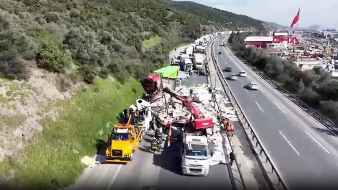 TEM Otoyolu’nun Kocaeli geçişinde lastiği patlayan ve sağ şeritte duran TIR’a, arkadan gelen TIR çarpıp devrildi. Kazada devrilen TIR'ın sürücü yaralandı, otoyolun İstanbul yönü trafiğe kapandı. Kaza nedeniyle oluşan trafik yoğunluğu dronla görüntülendi.
